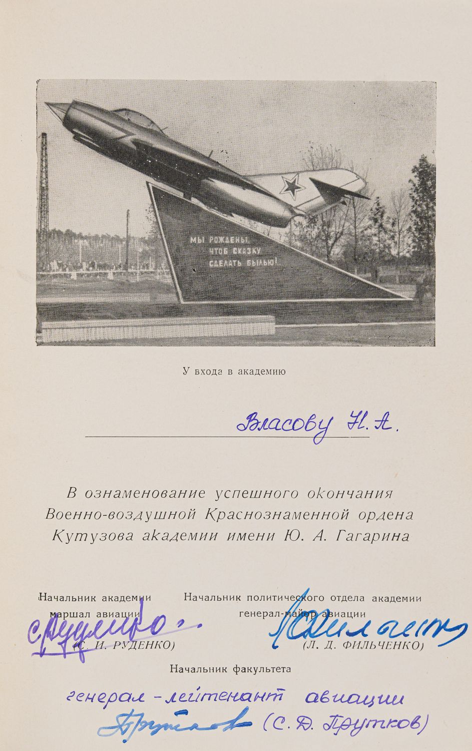 Дарственная надпись на фронтисписе Власову Н. А. от начальника академии, маршала авиации С. И. Руденко, начальника политического отдела академии, генерала-майора авиации Л. Д. Фильченко и начальника факультета, генерала-лейтенанта авиации С. Д. Пруткова. Подписи без расшифровки на титульном листе.