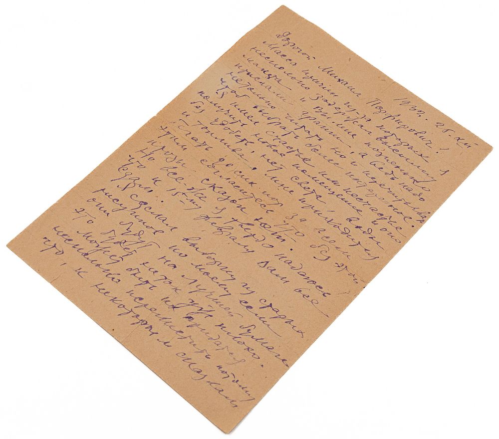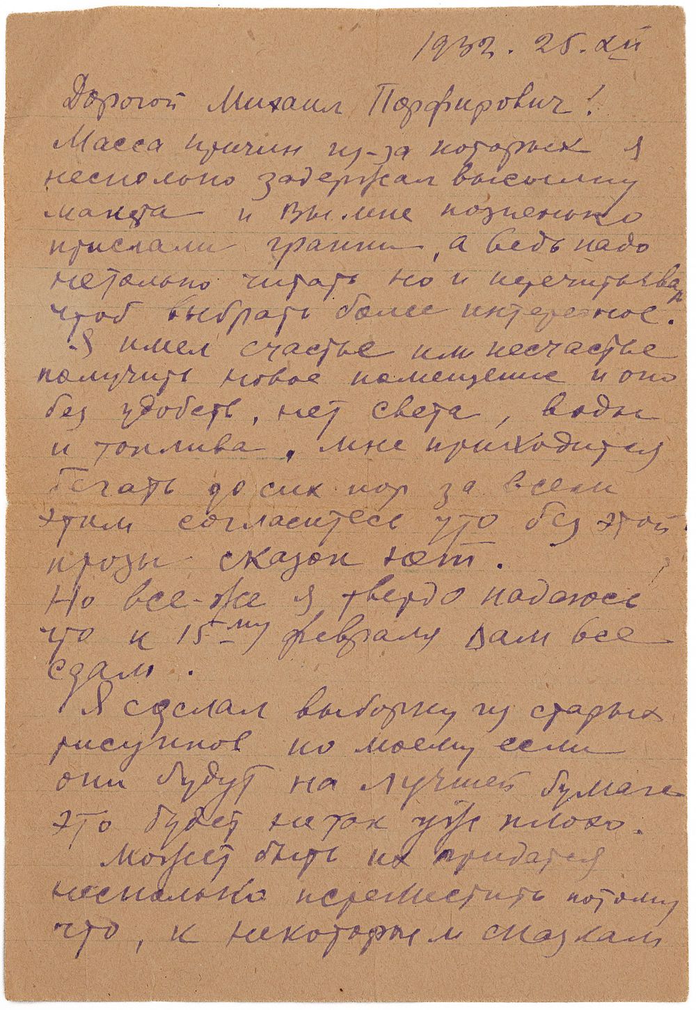 «…Я имел счастье или несчастье получить новое помещение и оно без удобств, нет света, воды и топлива. Мне приходится бегать до сих пор за всем этим согласитесь что без этой прозы сказок нет…».