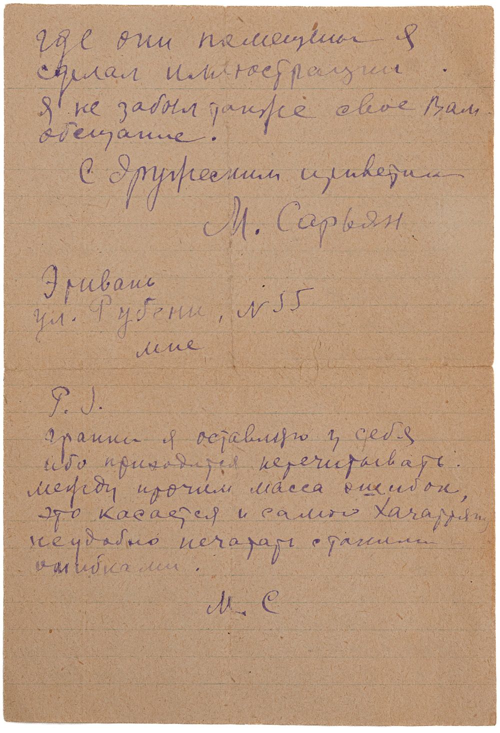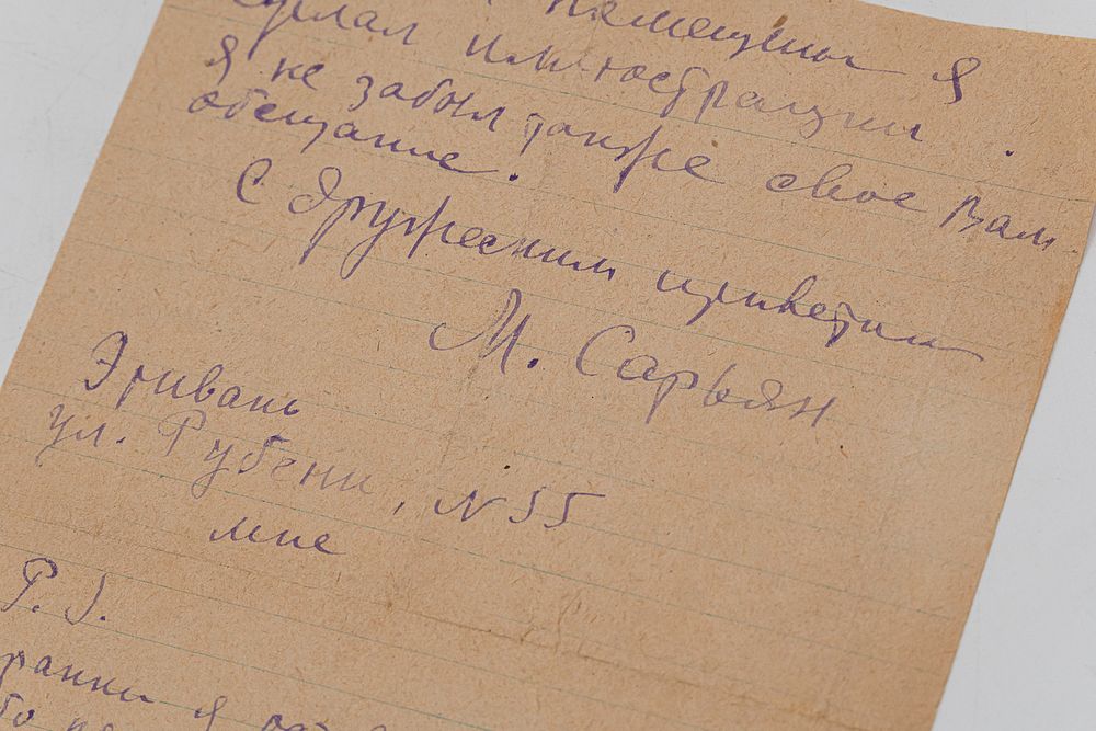 [1] л. = [2] c.; 21,3х14,5 см. Линованный лист, текст с двух сторон. Отправлено из Еревана.