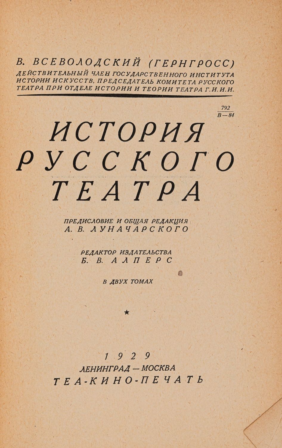 В. Всеволодский (Гернгросс): Действительный член Гос. ин-та истории искусств; ред. и предисл. А. В. Луначарского. Л., М.: Теа-кино-печать, 1929.