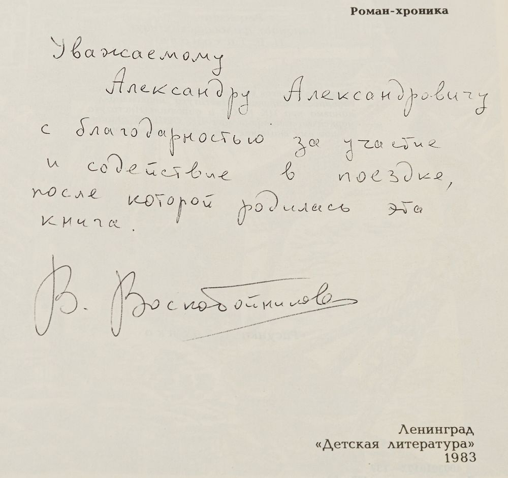 Автограф Александру Косорукову на титульном листе: «Уважаемому Александру Александровичу / С благодарностью за участие и содействие в поездке, после которой родилась эта книга. [Подпись]».