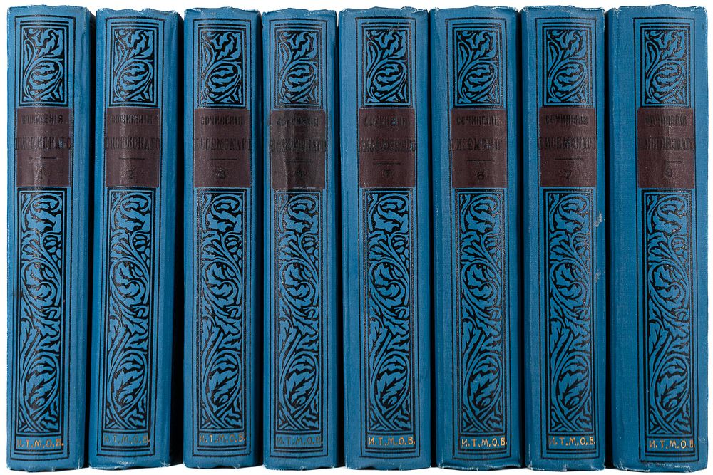 Сохранность – хорошая, трещины бумаги вдоль форзацев (Т. 1), небольшие надрывы тит. л. вдоль корешка (Т. 1), незначительные поперечные надрывы отдельных страниц, 1 л. факс. отделен от блока (Т. 1), утрата фрагмента уголка С. 652 (Т. 1), С. 15-16 частично отделены от блока (Т. 4), утрата 1 л. портр. (Т. 5), С. [1-2] частично отделены от блока (Т. 6), крупный надрыв С. 657-658 (Т. 6), нрзб. шт. на св. л. нахзаца (Т. 6-8), небольшое загрязнения переплёта по корешку (Т. 7), шт. бук. маг. на С. 784 (Т. 8), С. 783-784 частично отделена от блока (Т. 8), постраничная комплекция не проверялась.