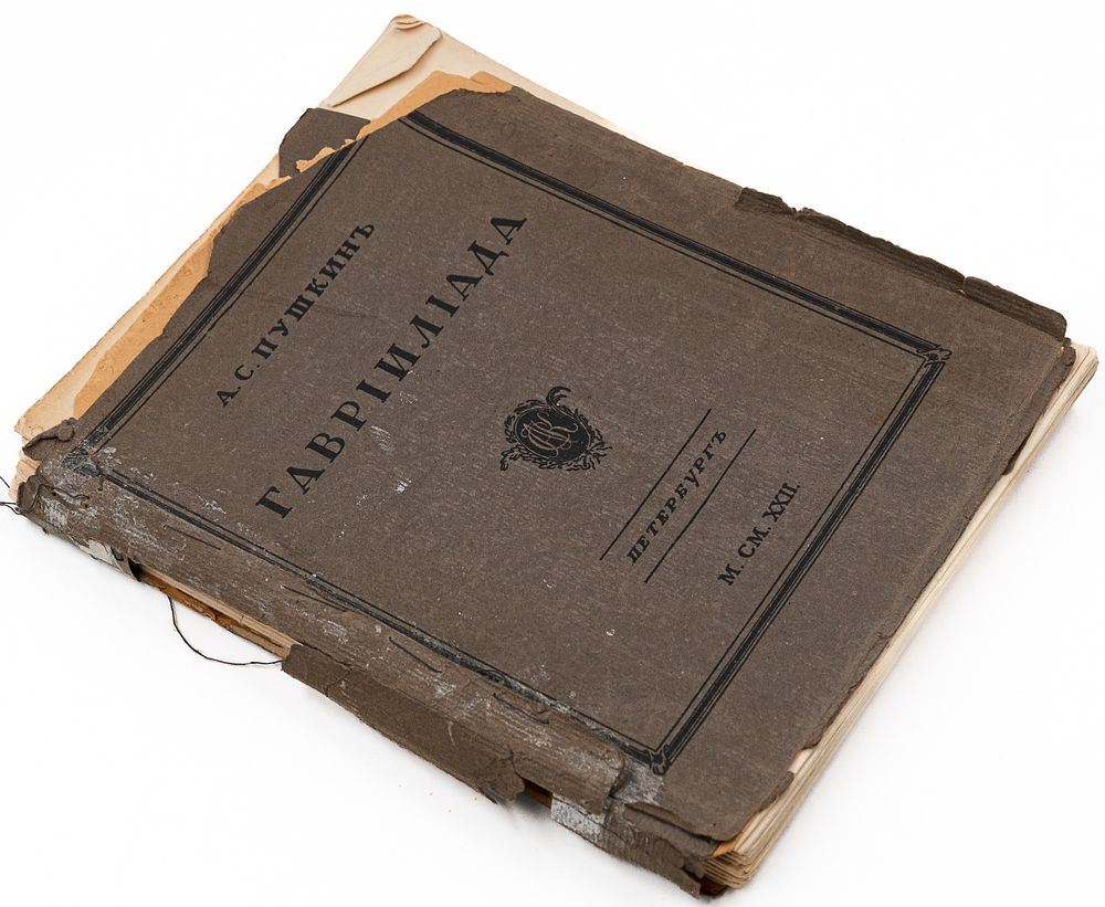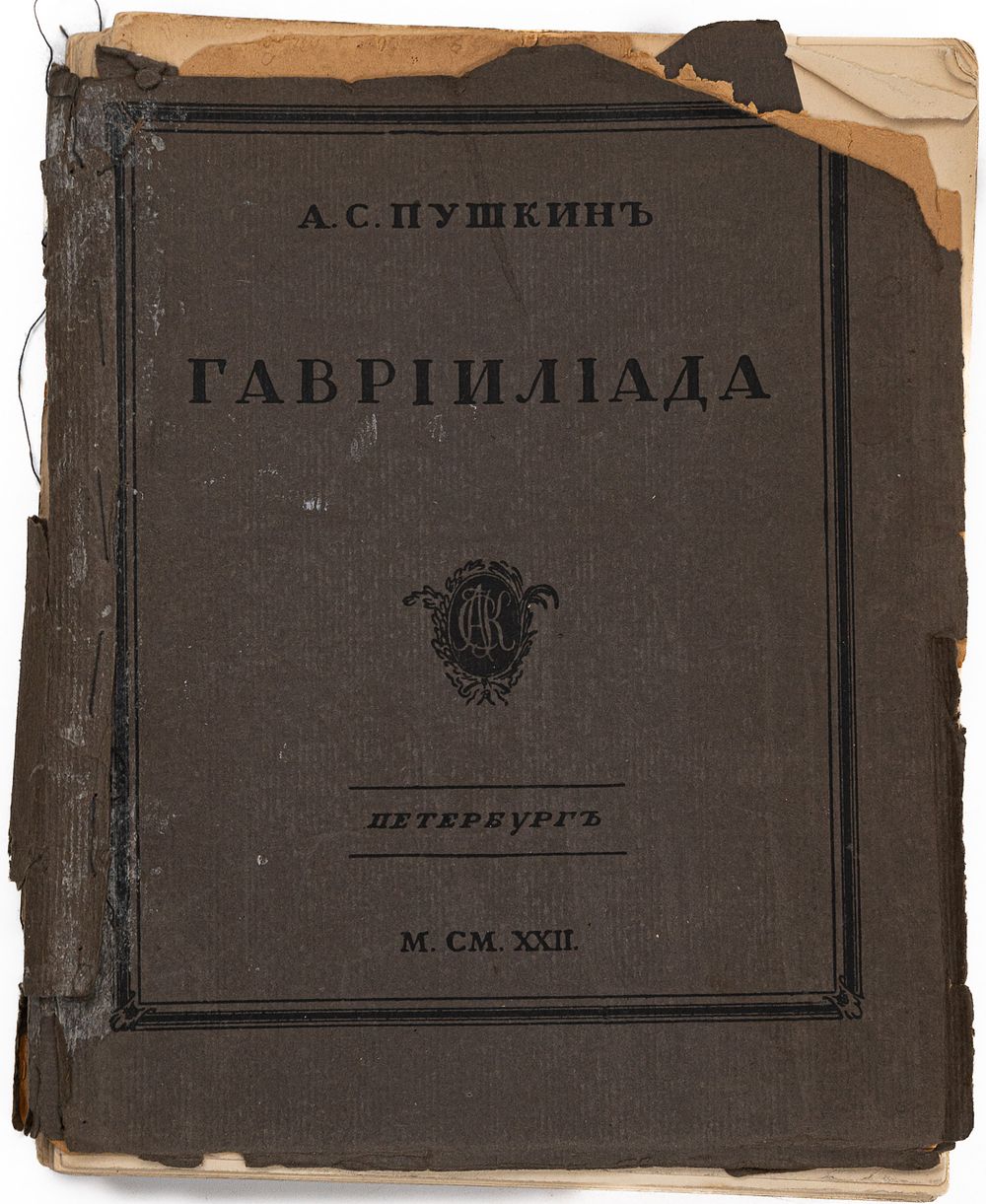«Гавриилиада» — поэма, написанная 22-летним А.С. Пушкиным, пародийно-романтически обыгрывающая сюжет Евангелия о Благовещении. Главный персонаж поэмы — архангел Гавриил. С христианской точки зрения является кощунственной. В царской России поэма не издавалась, не приписывалась А.С. Пушкину и была предана забвению. Ее воскресил из небытия уже после 1917 года поэт Валерий Брюсов, подготовивший несколько изданий «Гавриилиады». Отныне поэма включается во все собрания сочинений Пушкина. Настоящее издание поэмы является ее первой научной публикацией. Издание сопровождается серией статей о сюжете, композиции, языке, рукописях, изданиях поэмы, указателями, отпечатано на библиофильской бумаге тиражом 1000 экземпляров в типографии (бывшей Голике и Вильборг) под наблюдением В.И. Анисимова. На издателя книги указывает вензель на суперобложке книги (А.С.К.): книга вышла в частном издательстве профессора Абрама Сауловвича Кагана (1889-1983), основателя издательства «Петрополис».