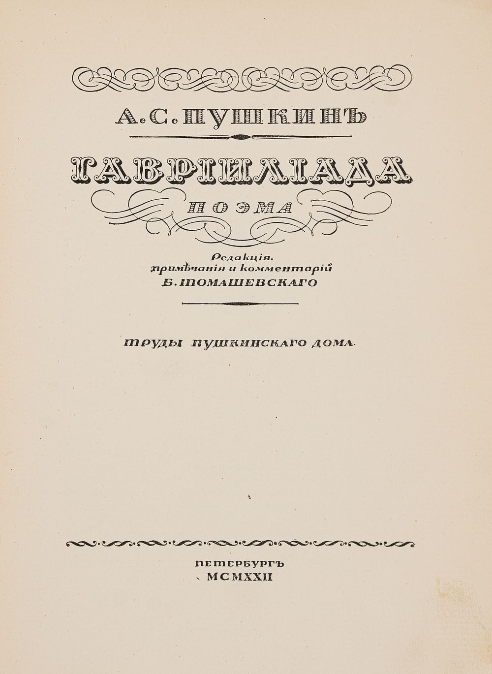 Ред., примечания и комментарии Б. Томашевского. Пб.: 15-я Государственная типография (бывшая Голике и Вильборг), 1922. — 110, [2] с., [1] л. портр.; 20,5х16 см.