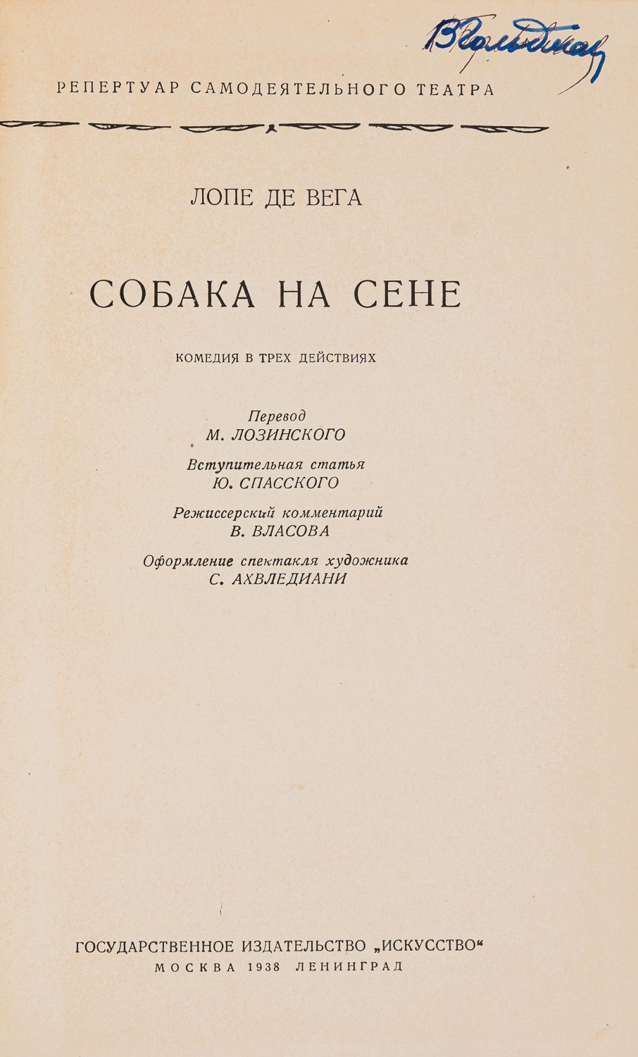Комедия в трех действиях; пер. М. Лозинского, вступ. статья Ю. Спасского, реж. комм. В. Власова. М., Л.: Искусство, 1938. – 132 с.: ил., [2] л. ил.; 22х14,5 см. – (Репертуар самодеятельного театра).