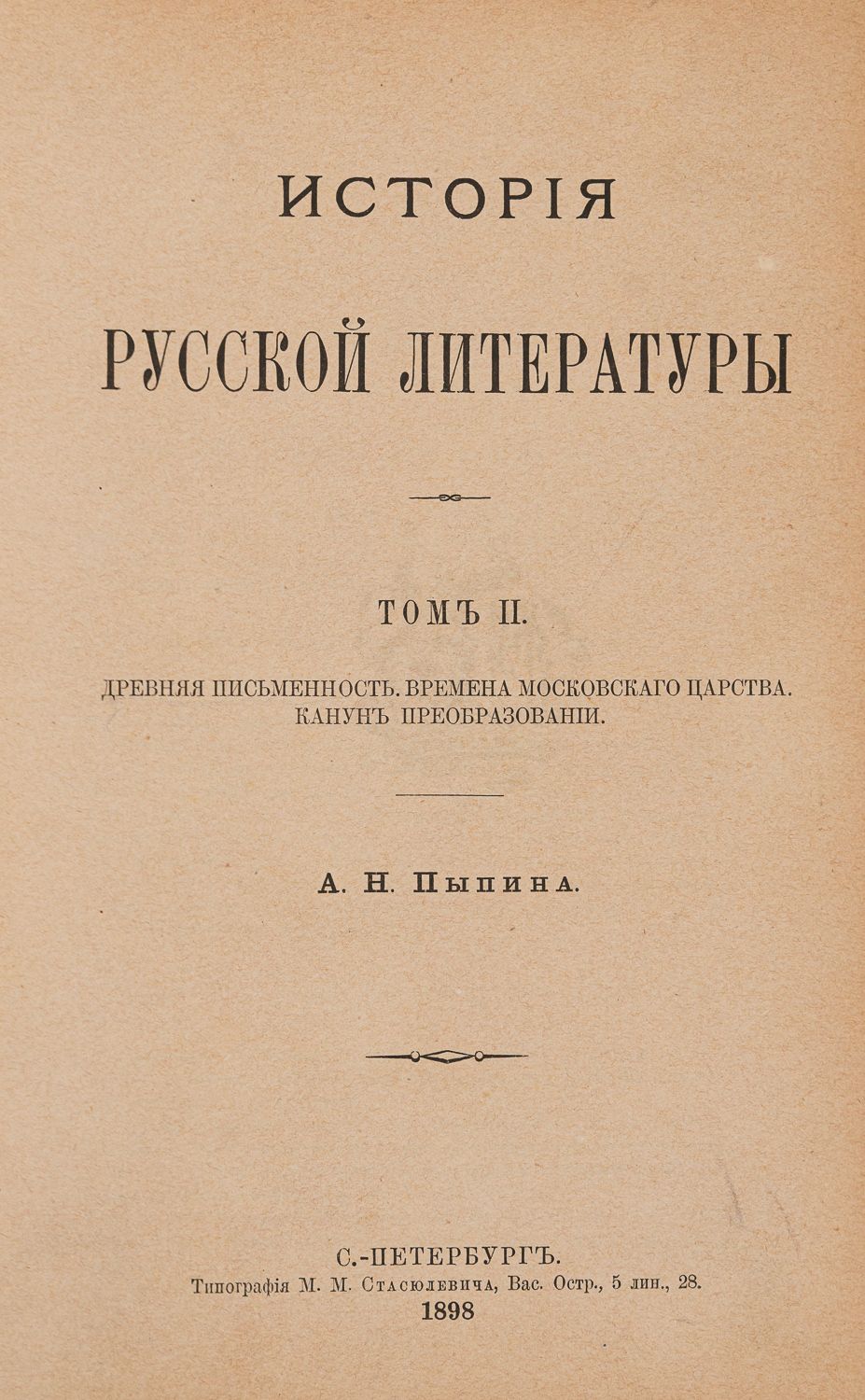 Т. 2: Древняя письменность. Времена Московского царства. Канун преобразовании. – 1898. – VI, 566 с.;