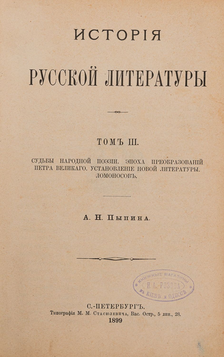 Т. 3: Судьбы народной поэзии. Эпоха преобразований Петра Великого. Установление новой литературы. Ломоносов. – 1899. – X, 535 с.; 23,5х16 см.