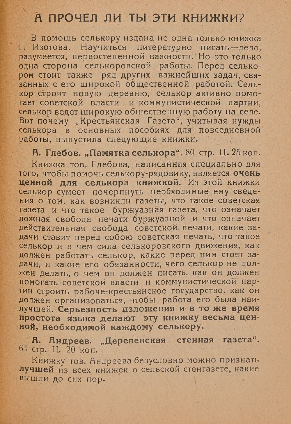 Начинающим писателям-селькорам. М.: Изд-во «Крестьянская газета», 1928. – 94 с., [1] л.; 14,2х10,8 см. – (Б-чка «В помощь селькору»).