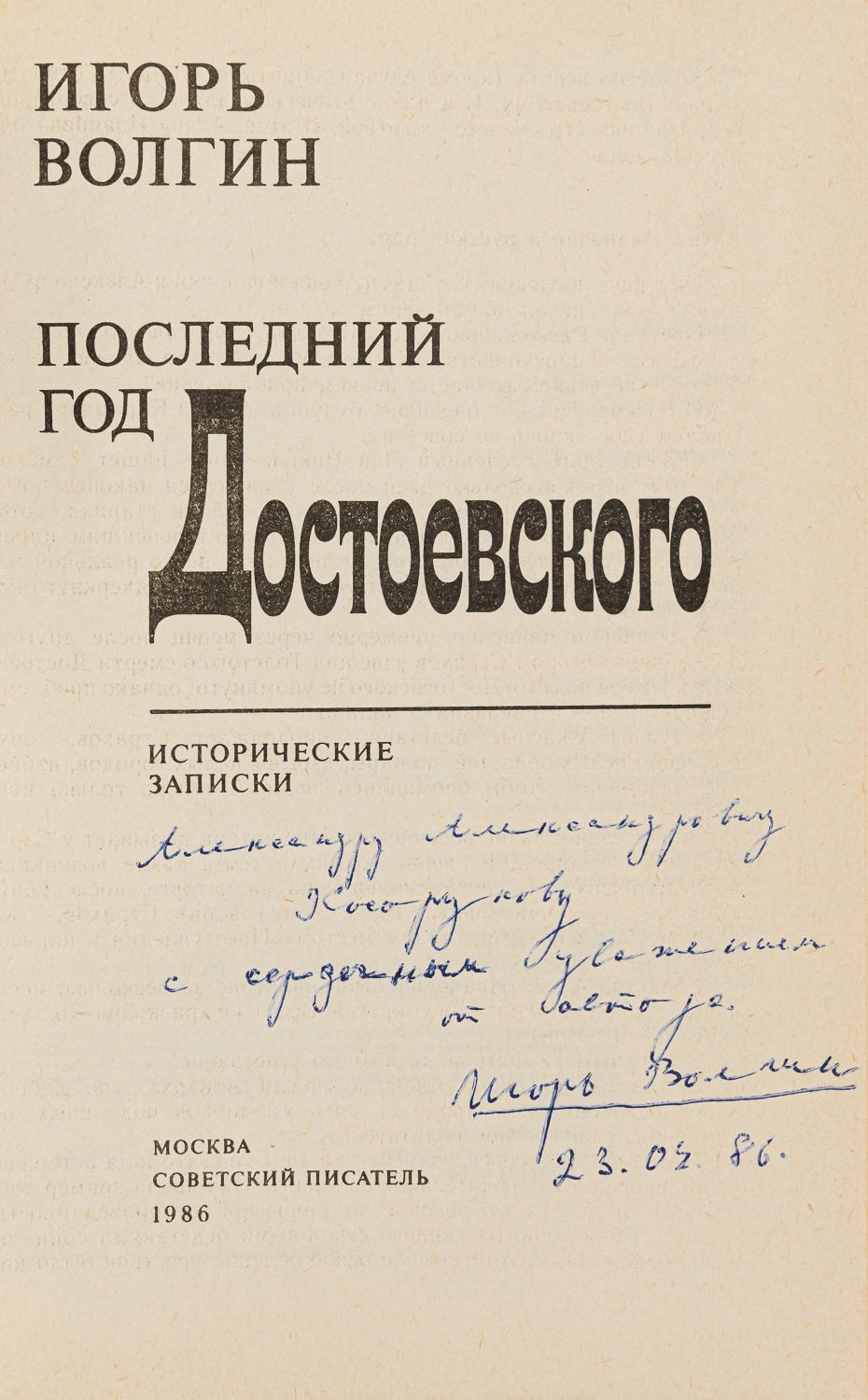 Автограф Александру Косорукову на титульном листе: «Александру Александровичу Косорукову с сердечным уважением от автора / Игорь Волгин / 23.04.86».