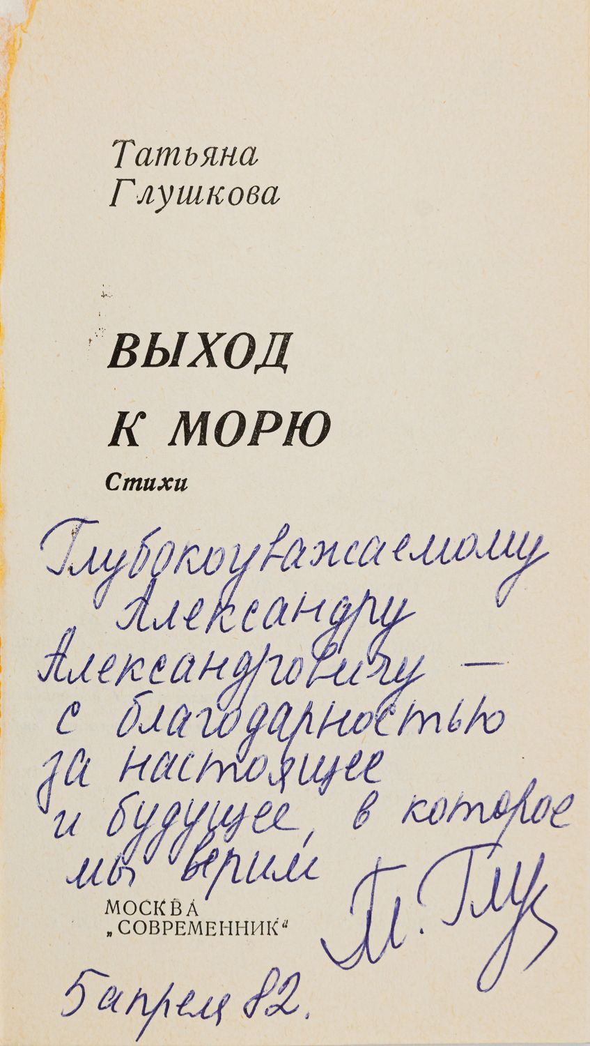 Автограф Александру Косорукову на титульном листе: «Глубокоуважаемому Александру Александровичу – с благодарностью за настоящее и будущее, в которое мы верим / 5 апреля 82. / [Подпись]».