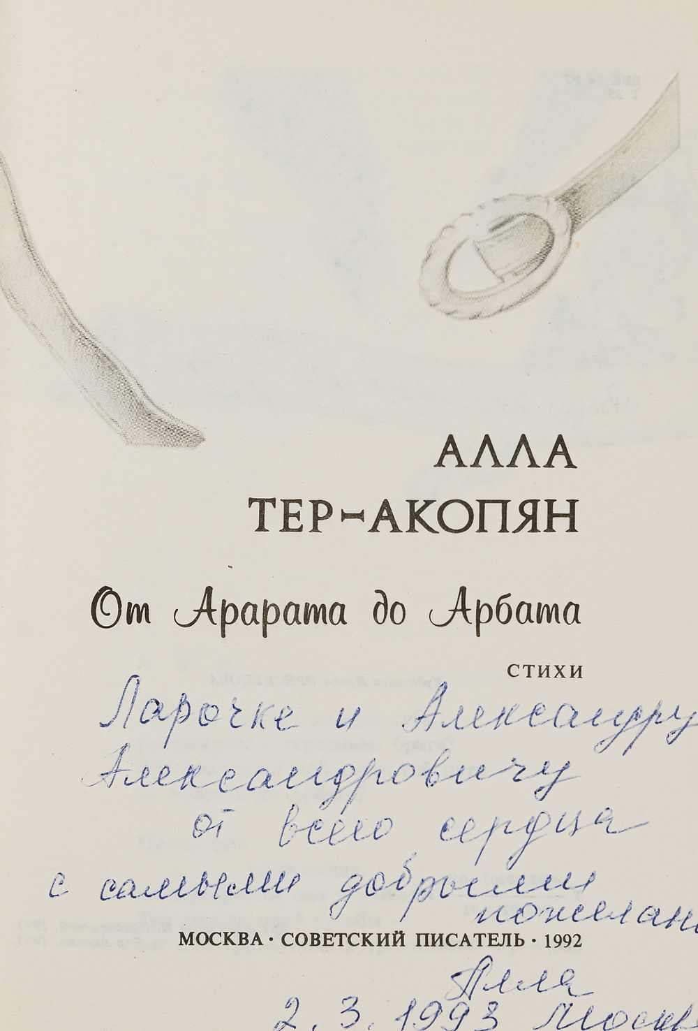 Автограф Александру Косорукову на форзаце: «Ларочке и Александру Александровичу от всего сердца с самыми добрыми пожеланиями. / Алла / 2.3.1993 Москва».
