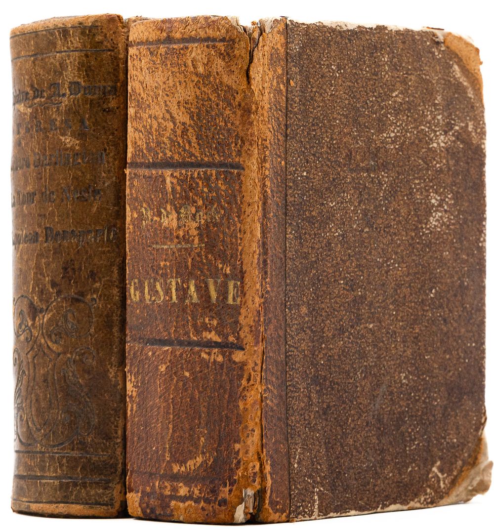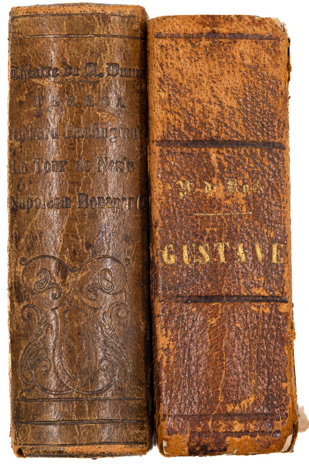 Владельческие составные переплеты (кожа, коленкор). Золотое тиснение на бинтовых кожаных корешках (на томе Дюма потертое).