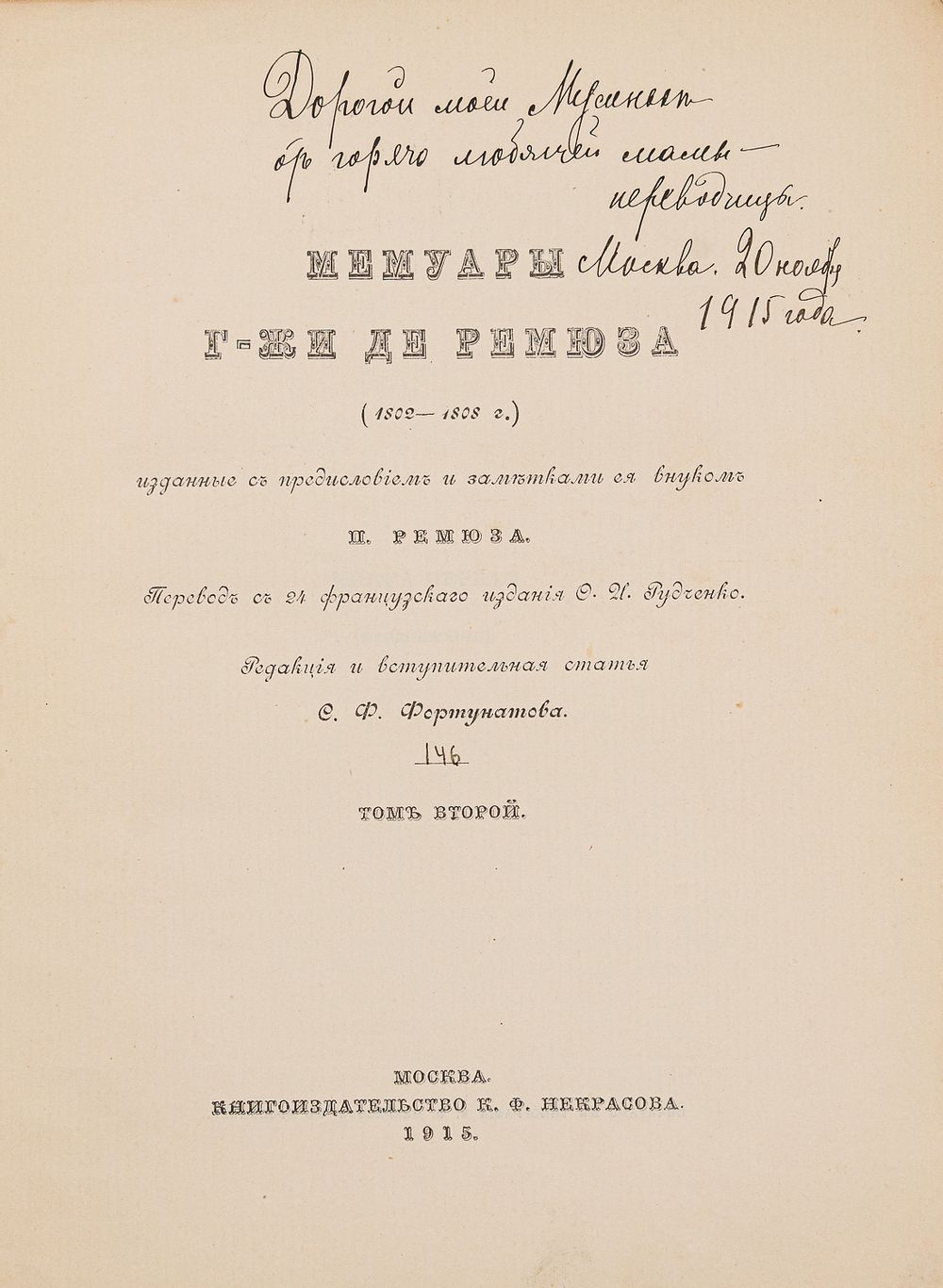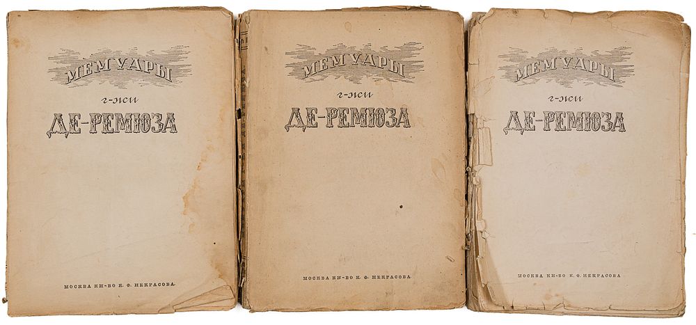 На форзацах владельческие надписи переводчика: «О. Рудченко», выполненная чернилами, каллиграфическим почерком; дальнейшая часть надписи неразборчива (Т. 1.), на форзаце надпись О.И. Рудченко: «Дорогой моей… от горячо любящей мамы — переводчицы. Москва. 20 ноября 1915 года», выполненная чернилами, каллиграфическим почерком (Т.2.), на форзаце надпись О.И. Рудченко: «Дорогой моей дочурке-ученице от горячо любящей мамы — переводчицы. Москва. 23/I 1915 года», выполненная чернилами, каллиграфическим почерком (Т.3.).