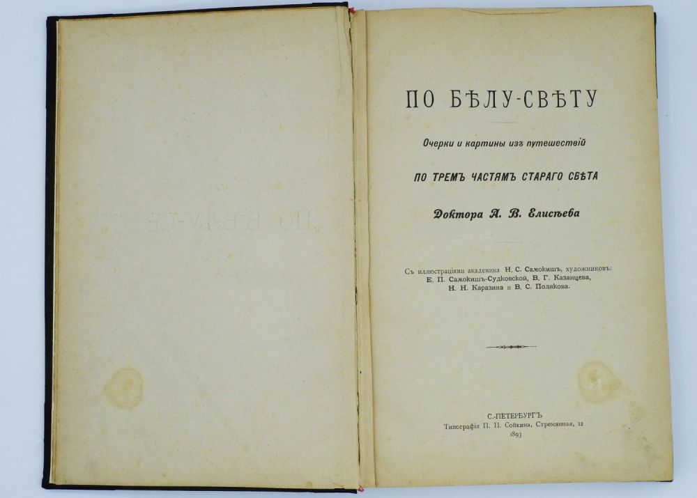 Очерки и картины из путешествий по трем частям Старого Света Доктора А.В. Елисеева. С иллюстрациями академика Н.С. Самокиш, художников Е.П. Самокиш-Судоковской, В.Г. Казанцева, Н.Н. Каразина и В.С. Полякова. [1] т. С.-Петербург, Типография П.П. Сойкина, 1893. – 373,3,[1] с.:ил.,[1] л.ил.